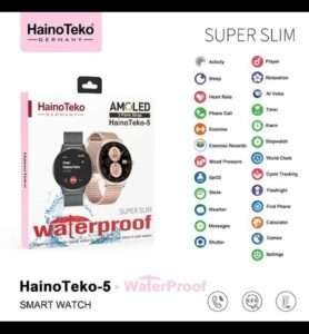 Haino Teko 5 Smartwatch features a slim design with Super AMOLED display, waterproof build, and 2-week battery life. Includes heart rate, blood pressure, and sleep tracking — perfect for stylish everyday use ⌚💖