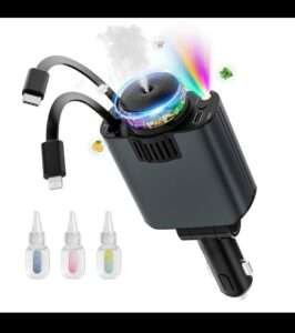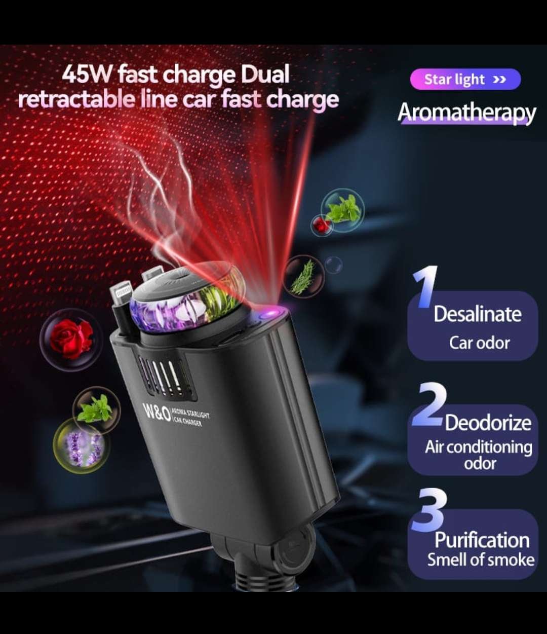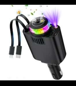 Starlight 5-in-1 Car Charger features 45W fast charging, retractable cables, ambient lighting, and a built-in perfume diffuser. Includes extra port β perfect for a smart and stylish drive πβ¨