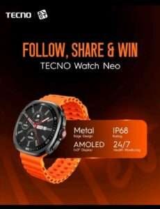 Tecno Neo Smartwatch features a Super AMOLED display, 2-week battery life, and advanced health tracking including heart rate, blood pressure, and sleep monitoring — perfect for modern gents ⌚✨
